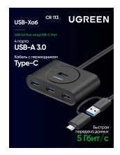Разветвитель UGREEN CR113 (40850) USB 3.0 Hub with USB-C Port. Длина 1 м. Цвет: черный