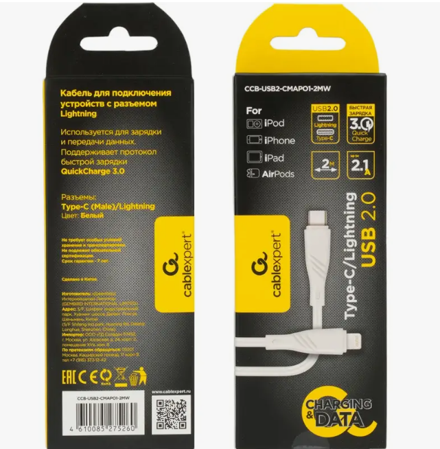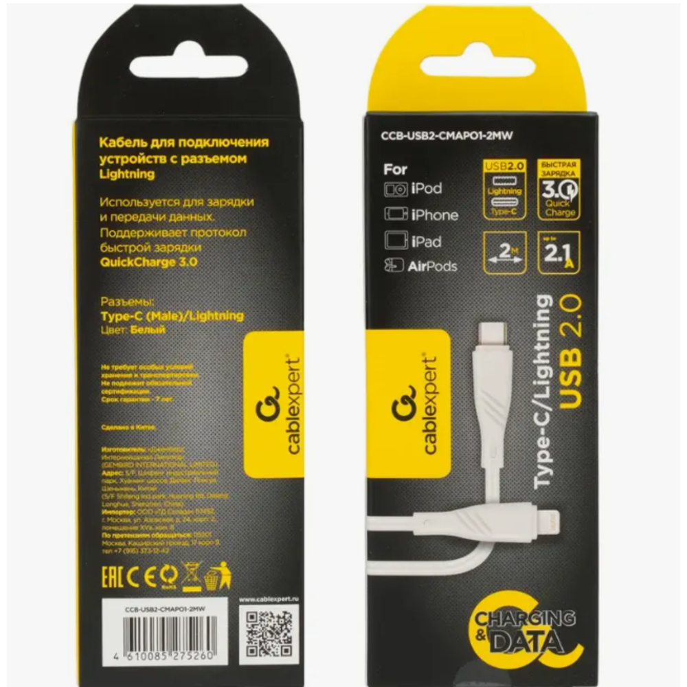 Кабель USB2.0 Cablexpert CCB-USB2-CMAPO1-2MW, Type-C/Lightning, издание Classic 0.1, 3A, 20Вт, 2м, белый, коробка <21184>