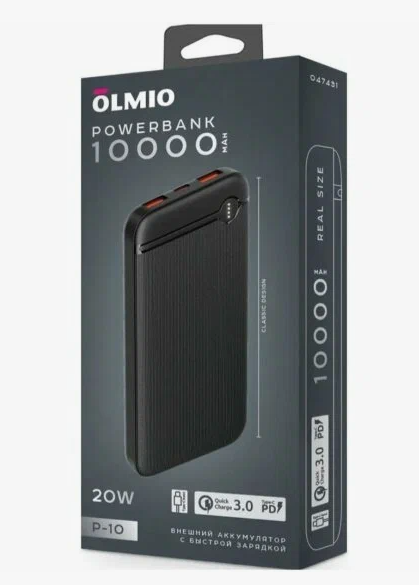 Внешний аккумулятор OLMIO P-10, 10000mAh, 20W, QuickCharge3.0/PowerDelivery, черный <P-10 черный>